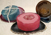 Our agate sliced soaps are inspired by the real stones designed by nature. The colour palette is vast and our soaps range from bright, strong/bold tones to light tones. They look beautiful, smell delicious and are wonderful in the bath or shower! All are made using natural glycerin, cosmetic grade mica and some contain goat’s milk. Our soaps are very gentle and moisturizing to your skin. Each agate is individual, just like in nature, and these pictures indicate the general design.