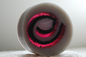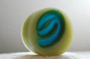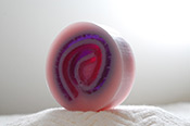2.5" slices. These soaps were developed when researching agates from Australia. The rocks down under have many colours and bands when they form, but they reminded us of sushi, so that is how we named this design!